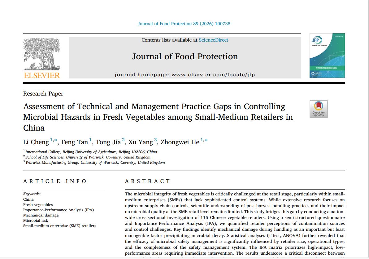 近日,何忠伟教授与成黎教授团队在国际食品安全领域权威期刊《Journal of Food Protection》发表最新研究成果,题为《我国中小蔬菜零售商生鲜蔬菜微生物危害管控技术与管理短板评估》,为我国生鲜蔬菜零售环节的微生物安全管控提供了科学解决方案与实践路径。成黎教授为第一作者,何忠伟教授为通讯作者。