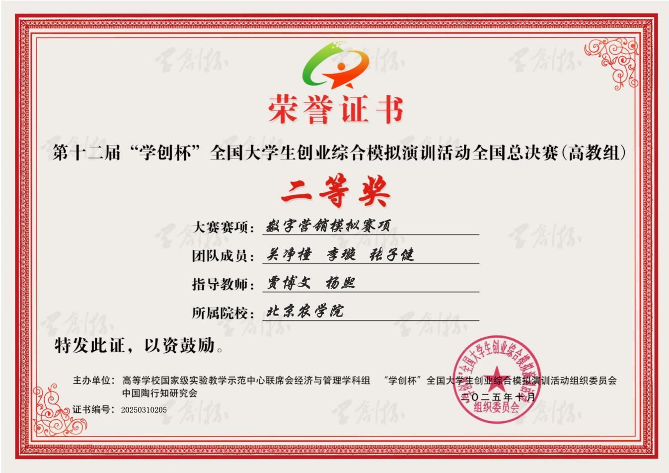 通过广泛动员、精心组织、悉心指导,斩获全国二等奖3项,包含数字营销模拟赛项2项及创业综合模拟赛项1项。
