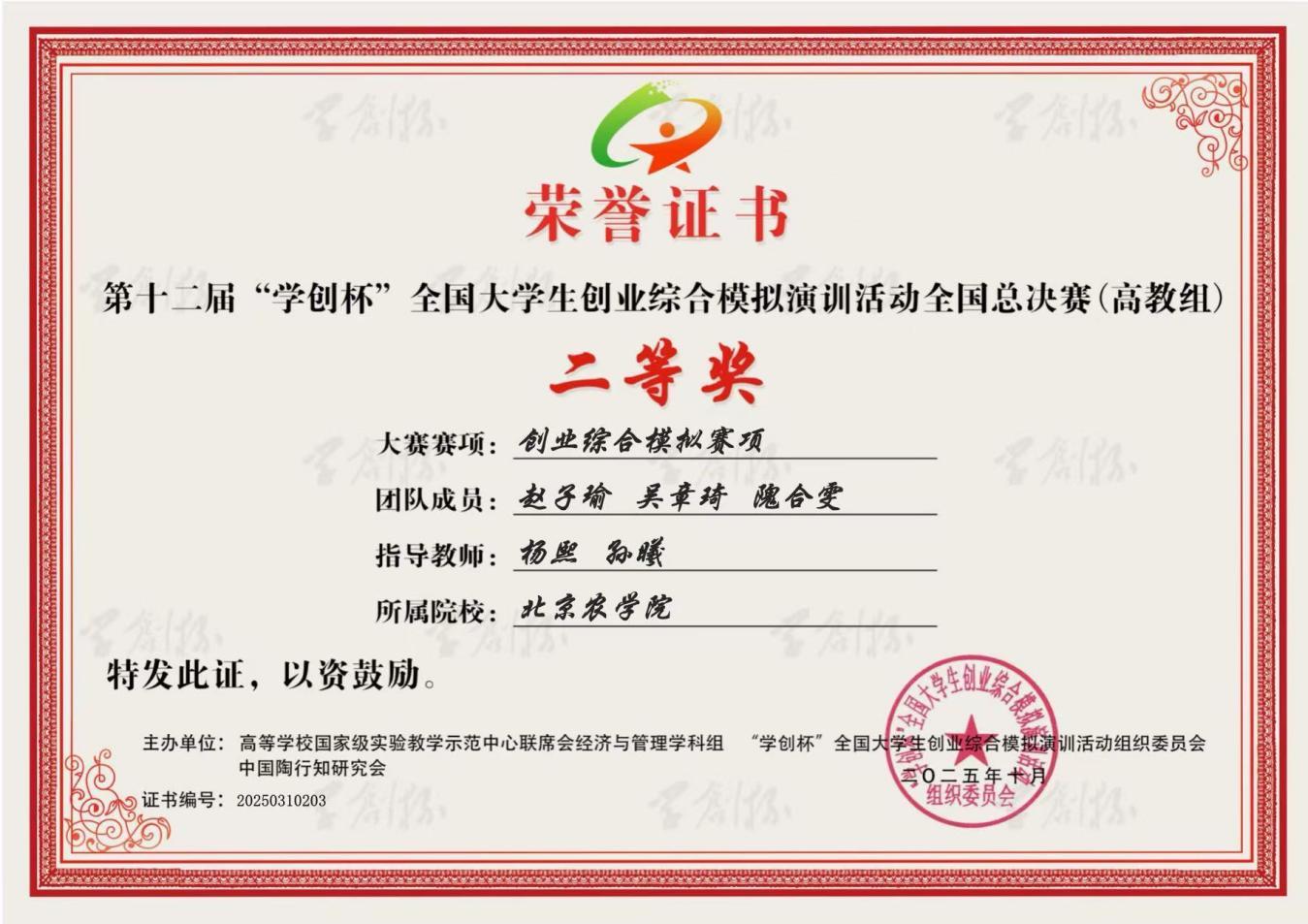 教师孙曦、杨熙的悉心指导下,荣获创业综合模拟赛项全国二等奖。